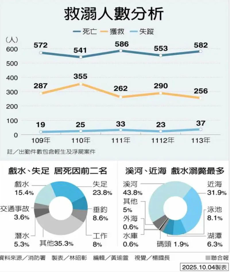 根據近期報導資料顯示,在過去 5 年中,全國溺水事故超過 2,000 件,其中「戲水」及「失足」為主因。事故地點中,以「溪河」43.8%最多,「近海」31.9%次之,「泳池」僅佔約 8%。