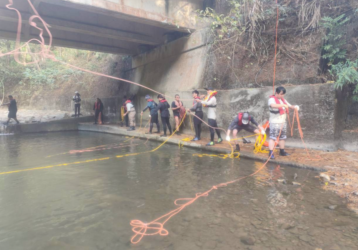此外教授繩索渡河、人鍊、拋繩袋救援。繩索原則為「不綁死於身上」,並確保上游人員掌握主繩,必要時以鐘擺方式回撤。