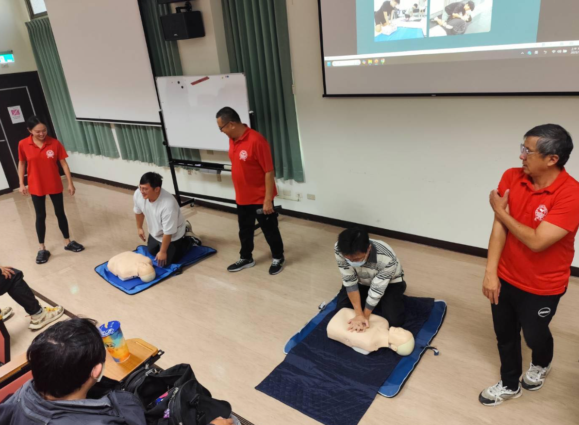 課程最後說明 CPR、AED使用、失溫與高溫症處理、止血包紮、搬運技巧。