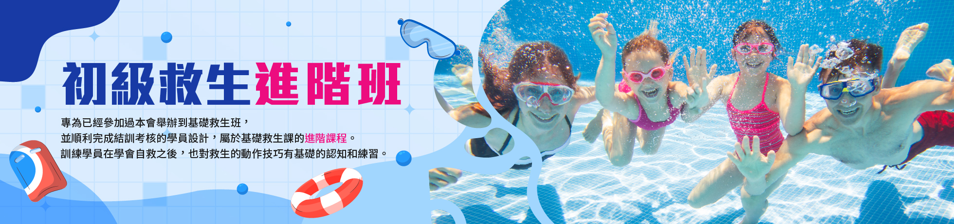 本課程是專為已經參加過本會舉辦到基礎救生班,並順利完成結訓考核的學員設計,屬於基礎救生課的進階課程。訓練學員在學會自救之後,也對救生的動作技巧有基礎的認知和練習。