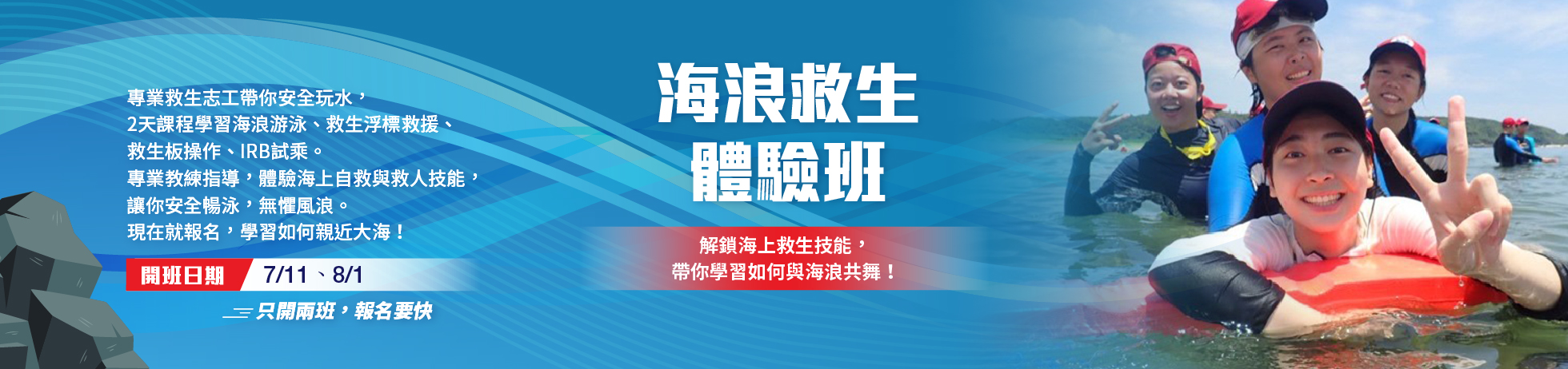 | 第二場 | 海浪救生體驗班 | 8/1 | 08:00-17:00 | 新北市萬里海邊水域。 |